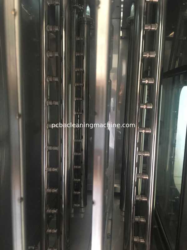 SME-820 procédé: lavage liquide à base d'eau-DI rincer à l'eau-air chaud souffler à sec. SME-820 dispose de 4 bâtons de pulvérisation de nettoyage fixes, 4 couteaux à air fixes 2 d'un côté gauche et 2 d'un côté droit du pochoir.